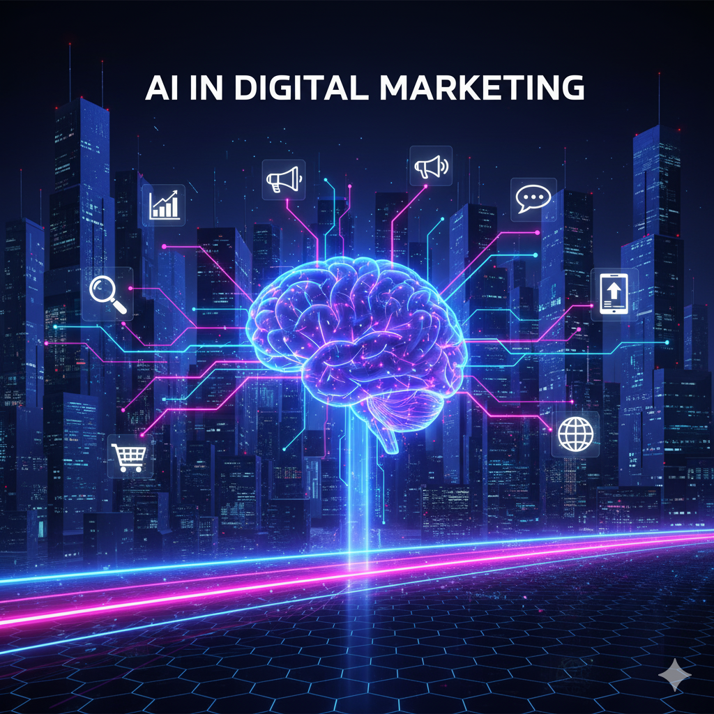 Artificial Intelligence (AI) is more than just a buzzword anymore – it is driving the next wave of digital marketing success. From writing to customer service, AI tools are empowering marketers to be more efficient, understand an audience better, and deliver personalized experience as never before. In this article, we will discuss how AI is changing digital marketing, some of the best AI tools for you to start using today in your digital marketing, and how to stay on the cutting edge of AI powered marketing. AI in Digital Marketing 1.What Is AI in Digital Marketing? AI (Artificial Intelligence) in digital marketing is the practice of using intelligent systems that can interpret data, identify patterns in data, and execute decisions on autopilot, faster and more accurately than humans, sometimes. AI in Digital Marketing AI is like your always-on digital marketing assistant, helping you with: Understanding what your audience is doing Writing and optimizing content Greater efficiencies in ad management Predicting what the customer will want next AI will not replace marketers, it will enhance marketers by automating repetitive tasks and giving deep understanding AI in Digital Marketing 2. Why AI is Revolutionary in Marketing AI in Digital Marketing Before artificial intelligence, marketers relied on instinct and manual analysis of data. In contrast, with AI, the level and scale of precision, personalization, and automation, are simply not possible. Here’s how it qualifies as being revolutionary: First, data driven decisions: AI condenses considerably large data sets into meaningful insights.Next, automation: Email scheduling, A/B testing and ad optimization, etc. can simply run automatically. AI in Marketing Digital : How Artificial Intelligence is Transforming the Future of MarketingAfter that, personalization: Every single user can personally experience different unique content based on their preferences. 💬 Finally, 24/7 customer support: AI Chatbots enable instant answers and customer support whenever needed 3. Available AI Applications Over Digital Marketing Channels  AI in Digital Marketing Let’s now breakdown how AI is interrupting the different parts of digital marketing.  a. Content Creation and Copywriting AI Tools can now assist you in seconds to generate blogs, captions, ad headlines and even videos.  Some popular tools include:  Chat GPT / Jasper AI – Writing blog posts, ad copy and ideas  Copy.ai – Short-form marketing content and product descriptions  Synthesiahttps://www.synthesia.io/ / Pictory: For creating AI-generated videos from text. Pro Tip: Drafts and Ideas Using AI — but be sure to add your bb. Search Engine Optimization (SEO)AI is changing the SEO game by making it easier for marketers to better understand what users are looking for in addition to optimizing better overall. You can rely on tools like Surfer SEO, Frase, and Clearscope to tell you what to include in your content after analyzing the highest-ranking pages. AI in Digital Marketing AI can also help with: Keyword research Content structuring Meta tag optimization Determine ranking opportunities As a result of utilizing an AI SEO tool, you can have content that not only sounds great — also ranks well. c. Social Media Marketing AI in Digital MarketingManaging different social media platforms can be a lot of work —AI tools make it simple. AI can help you: Schedule posts automatically Analyze engagement and audience reach Identify optimal times for posting Generate content ideas Tools to try: Lately AI: will take any long-form content and pull multiple social posts from it. Predis.ai: creates the entire post and captions for you. Metricool: Uses AI to predict what your audience will do and analyzes performance. Growth Hack: Use AI to understand what posts have performed well and replicate the tone, visuals and timing for success. d. Email Marketing The personalization that AI has given to email marketing has transformed the space. Companies already like HubSpot and Mailchimp, along with other companies like ActiveCampaign already use AI to determine, for example, which subject lines, what time of day to send, and what content, have the best open rates and engagement. AI in Digital Marketing AI can also assist with: Audience segmentation on a autopilot Personalized content and its product recommendations Engaging customers to influence open and click ratesExample: You receive a message from Netflix that says “recommended for you”. The messages Sent are generated and personalized with AI predictive responses and that’s why they feel like they were handpicked just for you. e. Paid Advertising (PPC & Social Ads) AI in Digital Marketing Managing and running ads has changed a lot since people manually had to set and manage their ads based on what was working. Most of the ad optimization is now done by AI. Systems already like Google Ads, Meta Ads, and Tik Tok Ads utilize AI to: Adjust your bid price automatically Target your ad to the correct audience Optimize the performance of the creative There are even AI ad tools like AdCreative.ai and Smartly.io that can all design, A/B test, and optimize ad creatives in record time. 4. The Benefits of AI in Digital Marketing AI in Digital Marketing Let’s take a look at what makes AI such a powerful partner for marketers. Saves Time AI takes over repetitive tasks such as scheduling content, sorting email pitches and conducting data analysis. With AI in your toolkit makers get to focus on marketing strategies rather busywork. Improves Accuracy AI prevents human error in data entry and ad management, and it finds trends that people can’t see. Provides Personalization at Scale From product suggestions to personalized landing pages, AI makes sure that each user has a personalized experience based on their behavior. Anticipates Future Trends AI goes beyond simply examining the past to actually predict future behaviors, making [marketers] can make ch